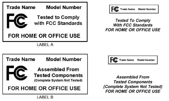 The equipment responsible party (usually the manufacturer or importer) tests the product at a qualified testing institution designated by the FCC to ensure that the equipment meets relevant technical standards and retains the testing report. The FCC has the right to require the responsible party to submit samples of the equipment or testing data of the product. The equipment applicable to the conformity declaration includes home computers and peripherals, civilian broadcast receivers, super regenerative receivers, other receivers under FCC Rule Part 15, television interface equipment, cable system terminal equipment, and industrial research and medical equipment for mass consumer use under Part 18. The responsible party shall make the following markings on the equipment: