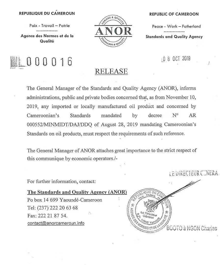 近日,喀麥隆標準與質(zhì)量局ANOR通知喀麥隆裝船前符合性評估方案 PECAE (Cameroun Pre-shipment Evaluation of Conformity) 更新要求。自2019年11月10日起(合同日期或發(fā)票日期),所有進口至喀麥隆或當(dāng)?shù)厣a(chǎn)的且在法令A(yù)R000552/MINMIDT/DAJ/DDQ要求下的喀麥隆標準相關(guān)的石油產(chǎn)品,被列入PECAE的管控范圍內(nèi), 并開始強制執(zhí)行其規(guī)定的產(chǎn)品符合性評定程序。