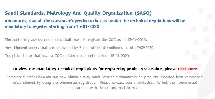 2020年1月15日起,出口沙特所有管制產(chǎn)品強制通過SABER注冊
