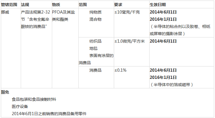 2013年6月28日,挪威環(huán)保局宣布了一項(xiàng)消費(fèi)品中PFOA及其鹽類和酯類的國(guó)家禁令。限制令適用于固體和液體產(chǎn)品,也包括紡織品。