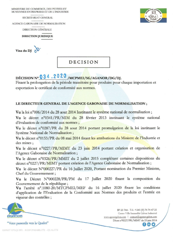 近日,加蓬標(biāo)準(zhǔn)化機(jī)構(gòu) AGANOR (Agence Gabonaise de Normalisation) 再次發(fā)布了最新公告,為了能促進(jìn)更多人理解并更好地執(zhí)行該方案,決定將新法令執(zhí)行過渡期再推遲至2021年6月30日。