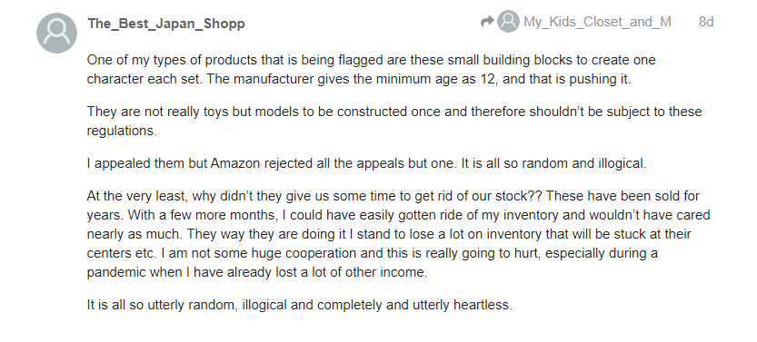 在論壇上,也有賣(mài)家表示兒童玩具產(chǎn)品遇到的安全審查,提交資料后被拒絕,listing也顯示被移除,且并不清楚是否還能申訴,讓該賣(mài)家一頭霧水。