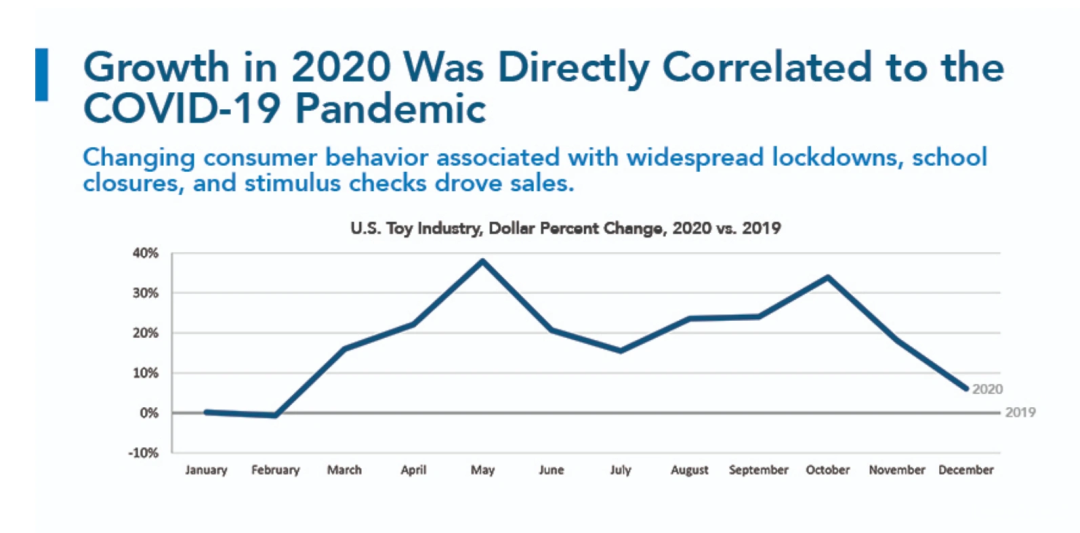 2020年美國(guó)玩具銷(xiāo)量大增歸因于學(xué)校停課、居家隔離和消費(fèi)者的線(xiàn)上購(gòu)物消費(fèi)行為,因此家庭支出從其他類(lèi)型的娛樂(lè)活動(dòng)紛紛轉(zhuǎn)向玩具。