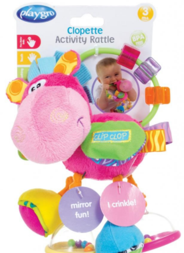 此次召回產(chǎn)品為Playgro的Clip Clop撥浪鼓玩具。產(chǎn)品為藍(lán)色毛絨小馬造型,四條腿中2條作為撥浪鼓、1條腿上有鏡子,馬背上有算盤和3顆珠子。側(cè)面標(biāo)簽上印有“Clip Clop”;縫合處的標(biāo)簽上印有批號(hào)010053、010082;產(chǎn)品包裝上印有UPC 9321104011459。