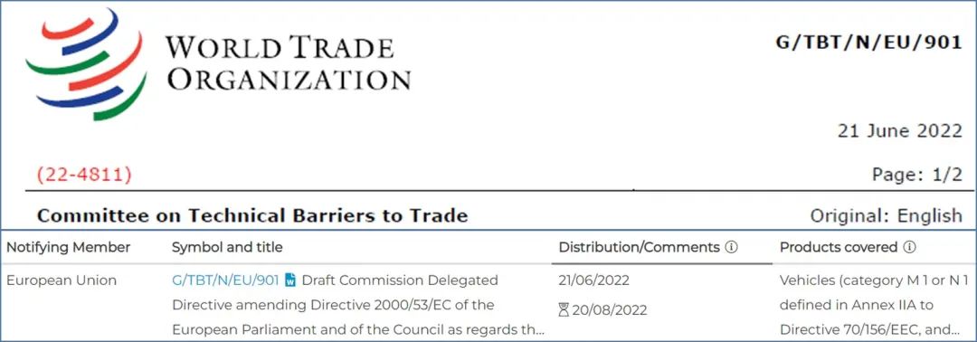 2022年6月21日,歐盟委員會向WTO的TBT委員會提交G/TBT/N/EU/901通知,擬對歐盟ELV指令(End-of Life Vehicles, Directive 2000/53/EC)的附件II(豁免清單)中用于加工用途的鋁合金,銅合金和某些電池中的鉛的豁免條款進行更新。