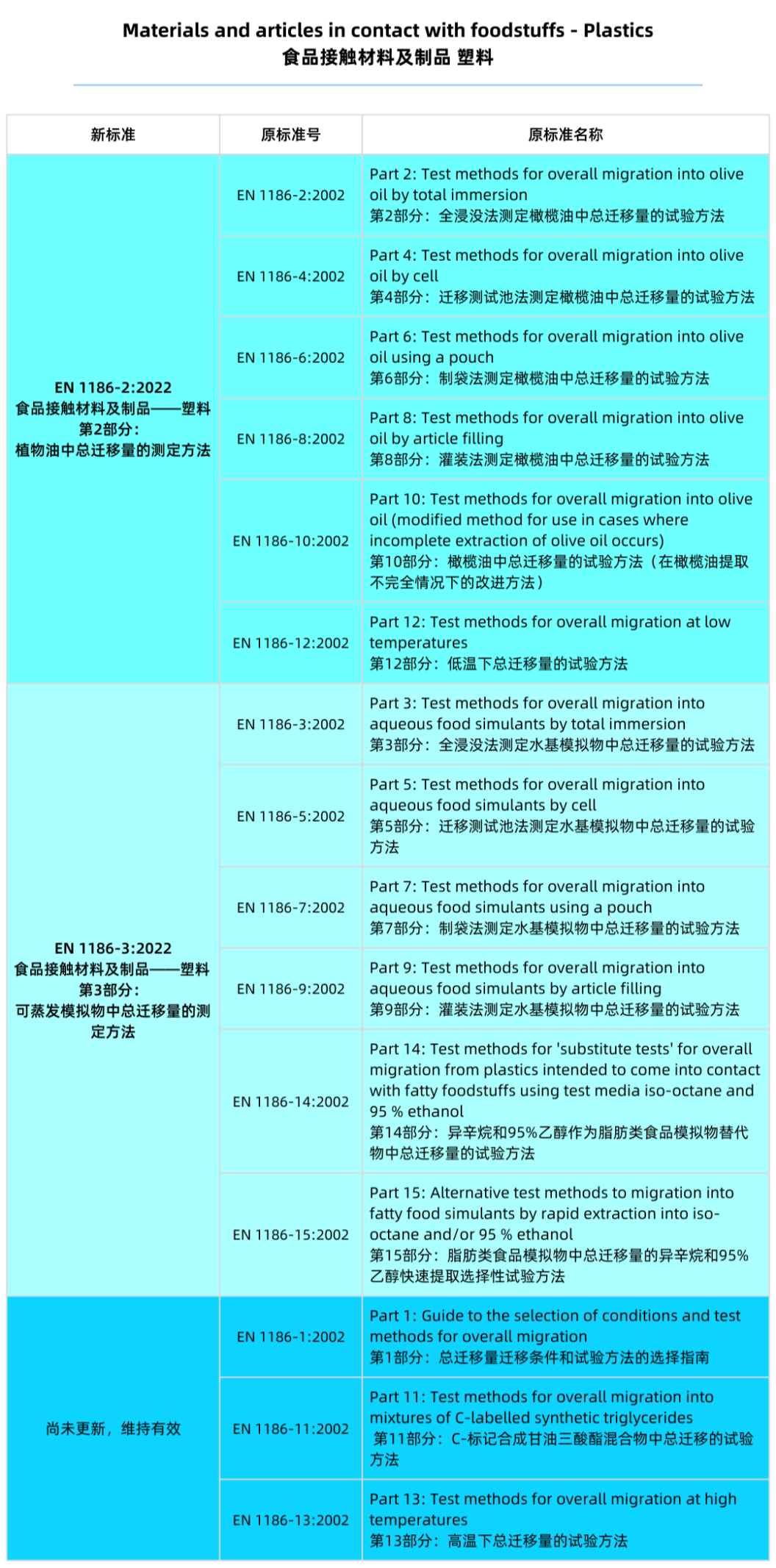 新版EN 1186-3:2022:將測試“水基模擬物及替代溶劑中總遷移量”的原六項2002版標(biāo)準(zhǔn)EN 1186-3、1186-5、1186-7、1186-9、1186-14和1186-15整合為一個標(biāo)準(zhǔn)。
