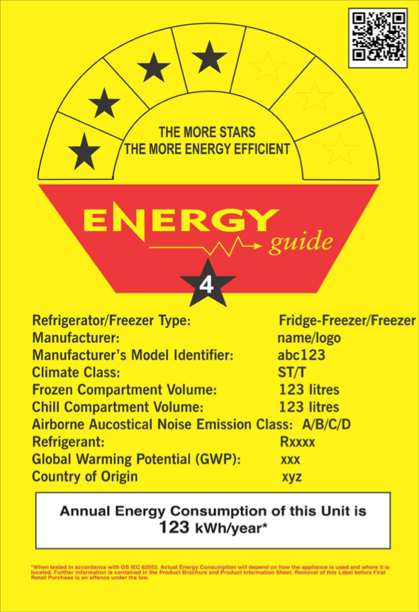 在新法規(guī)中加納要求電器制造商和進(jìn)口商必須持有必要的技術(shù)資料,例如:說(shuō)明書(shū)、符合能效標(biāo)準(zhǔn)的檢測(cè)報(bào)告、技術(shù)信息表等提交能效注冊(cè),在獲得加納委員會(huì)的授權(quán)后方能進(jìn)入加納市場(chǎng)。當(dāng)制造商或進(jìn)口商完成能效注冊(cè)后將獲得加納授予的唯一產(chǎn)品識(shí)別碼,該識(shí)別碼將直接體現(xiàn)在能效標(biāo)簽上。注冊(cè)后的能效標(biāo)簽示例如下: