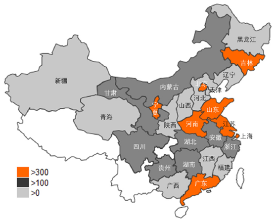 按照省市地劃分.廣東省.江蘇省.河南省.山東省.寧夏回族自治區(qū).吉林省.上海市.北京市等地發(fā)現(xiàn)的不合格項(xiàng)目數(shù)比較多。